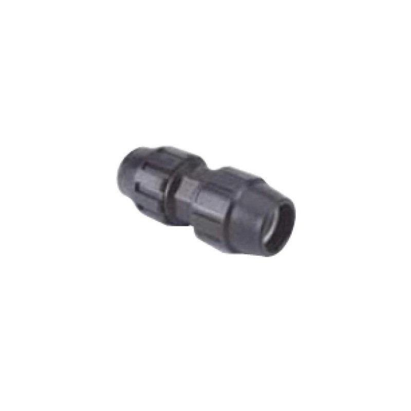 Enlace unión PE-PE polietileno para sistemas de conducción de presión. Accesorio de compresión fabricado en polipropileno con fibra de vidrio reforzado, con junta tórica en NBR70. Presión de trabajo de 10 Atm. a temperatura de agua 20º. Producto certificado por AENOR hasta Ø 63 conforme a Norma UNE EN 12201-5:2003 para uso en tuberías de PE 40.